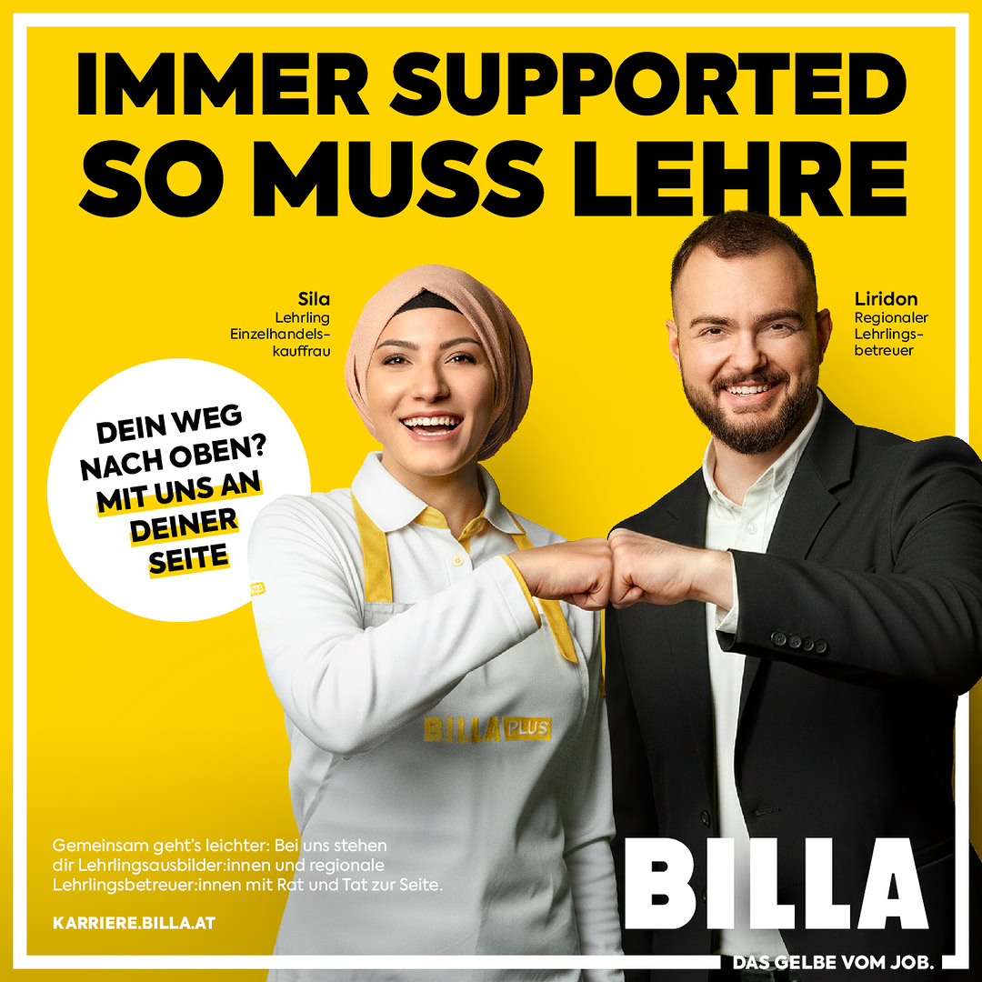 Marketler zinciri Billa, faaliyet gösterdiği AB ülkelerinde yürüttüğü kampanyalarda “çeşitliliği” öne çıkarıyor. Şubelerinde farklı göçmen grupların çalıştığını veya çalışabileceğini vurgulayan reklam dili, kapsayıcı bir toplumsal tablo sunuyor.