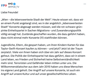 Özgürlük Partisi [FPÖ] Federal Başkanı Herbert Kickl konserlerin iptal edilmesi üzerine yazılı bir açıklama yaparak, “göç ve göç politikası konusunda tamamen başarısız olması nedeniyle sözde “en yaşanabilir şehir”deki konserlerin iptal edilmesi noktasına geldiğimizi biliyoruz. Artık konserlerin bile (!!!) yapılamayacağı koşullar yaratıldı” diyerek koalisyon hükümetini oluşturan ÖVP ve Yeşiller Partisini gelişmelerden sorumlu tuttu. Kickl açıklamasının devamında, Sosyal Demokrat Parti [SPÖ] ve Neos gibi parlamentoda sandalyesi olan partileri de eleştirerek, 2015 mülteci akınına atıfta bulundu.