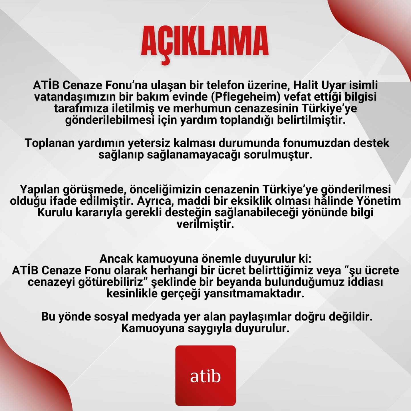 Sosyal medya platformlarında, ATİB Cenaze Fonu’nun Halit Uyar’ın cenazesinin Türkiye’ye götürülmesi için yaklaşık 1.750 Euro talep ettiğine yönelik paylaşımlar üzerine ATİB yazılı bir açıklama yaparak iddiaları yalanladı.