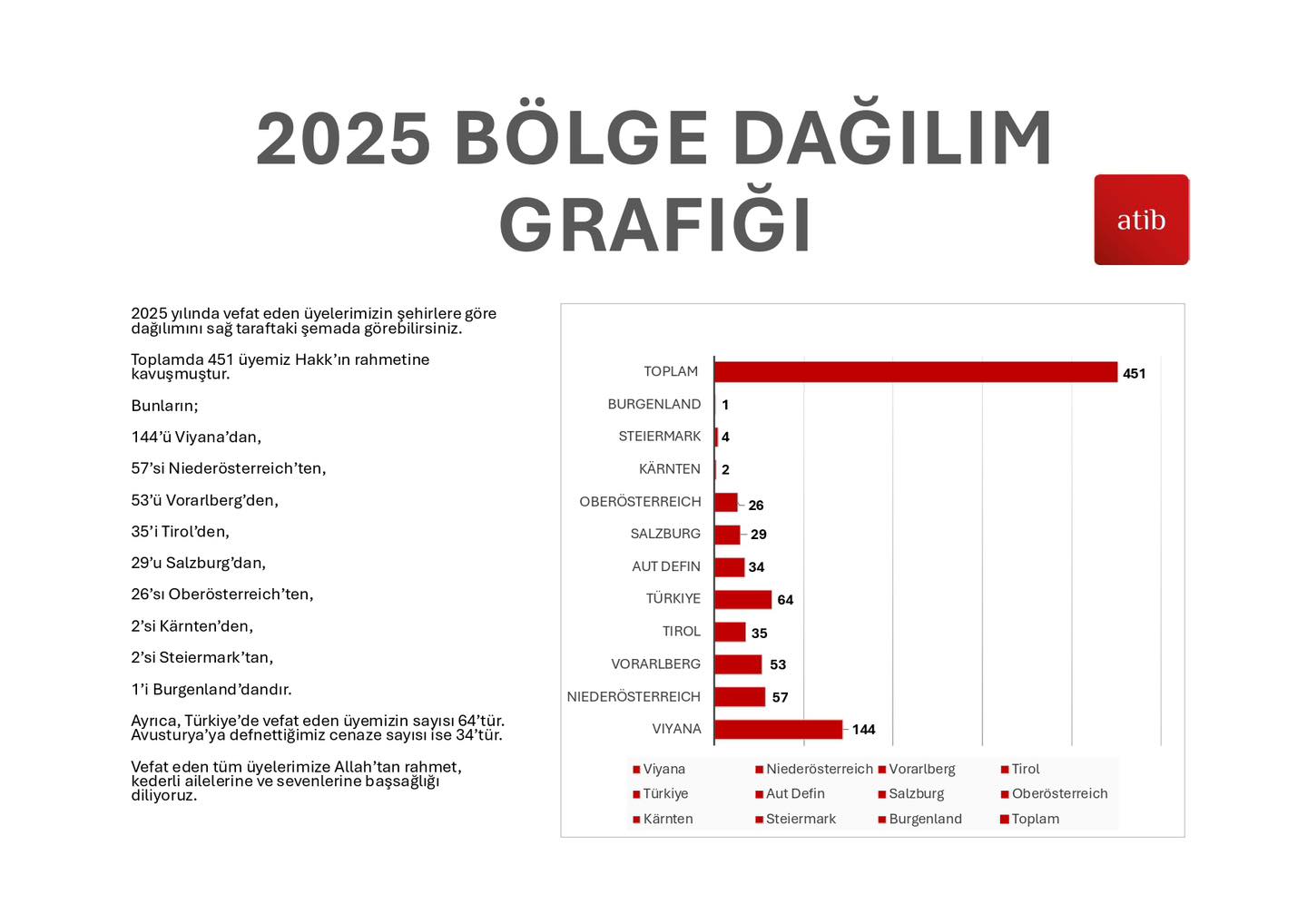 ATIB’in paylaştığı verilere göre, 2025 yılı içerisinde toplam 451 üye vefat etti. Vefat eden üyelerin Avusturya’daki eyaletlere göre dağılımı şu şekilde oldu: