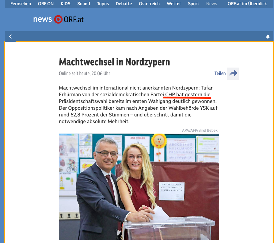 Avusturya Devlet Televizyonu [ORF] ve Avusturya Haber Ajansı [APA] haberi sayfalarına taşıyarak, “Uluslararası alanda tanınmayan Kuzey Kıbrıs’ta iktidar değişimi: Sosyal demokrat parti CHP’den Tufan Erhürman, Pazar günü yapılan cumhurbaşkanlığı seçimlerini ilk turda açık ara kazanarak zafer elde etti” alt başlığıyla duyurdu. Ancak ORF, seçimleri kazanan partinin ismini CTP yerine CHP olarak verdi. Bu, muhtemelen bir yazım veya alışkanlık hatası olarak değerlendiriliyor.