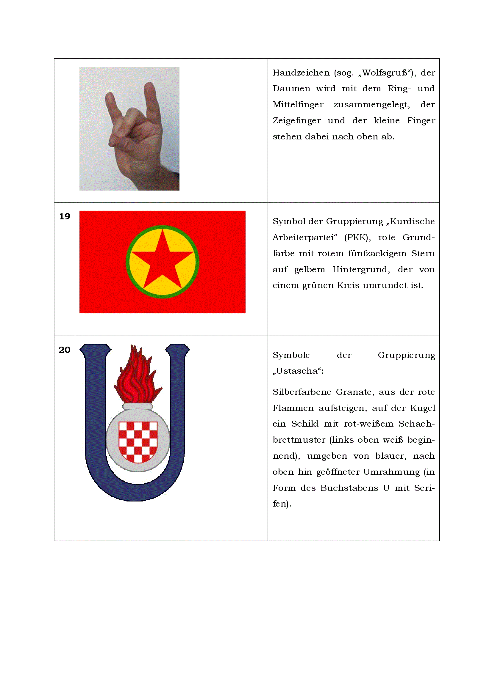 Bakanlığın yayınladığı yasaklar listesi, Müslüman Kardeşler, Filistinli örgütü Hamas, Hizbullah, Bozkurt, PKK ve Hırvat faşist Ustasha’nın işaretlerini içeriyor.