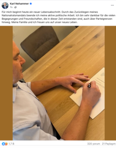 Salı günü, eski Avusturya Şansölyesi Karl Nehammer (ÖVP), Ulusal Konsey üyeliğinden istifa ederek aktif politikadan resmen emekli oldu. İstifa dilekçesini özel yemek masasında imzalayan Nehammer, sosyal medya üzerinden siyasetten tamamen çekildiğini duyurdu.
