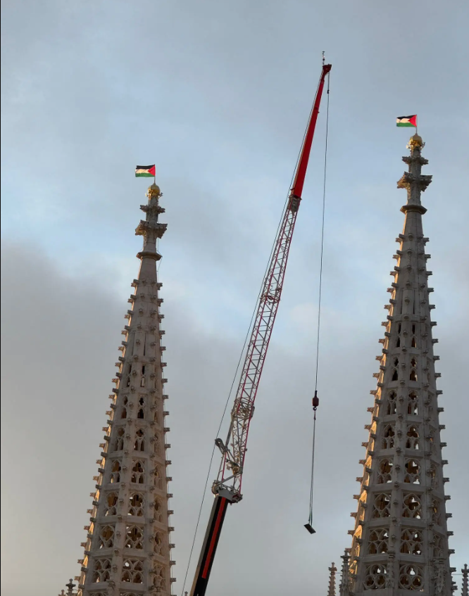 Cumartesi günü Viyana’daki Votivkirche’nin [Kilise] yaklaşık 90 metre yükseklikteki iki kulesine Filistin bayrağı asıldı. Bayraklar, ancak salı öğleden sonra bir vinç yardımıyla indirildi.