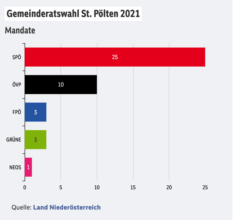 SPÖ, 1965’ten bu yana mutlak çoğunluğu elinde bulunduruyor ve son seçimde yüzde 56 oy alarak 25 sandalye kazanmıştı. Parti, 2004’ten beri belediye başkanı olan Matthias Stadler tarafından beşinci kez seçime taşınıyor. Stadler, seçim kampanyasının yoğun aşamasının başlangıcında “St. Pölten, Aşağı Avusturya’nın kırmızı kalbi olarak kalmalı” dedi.