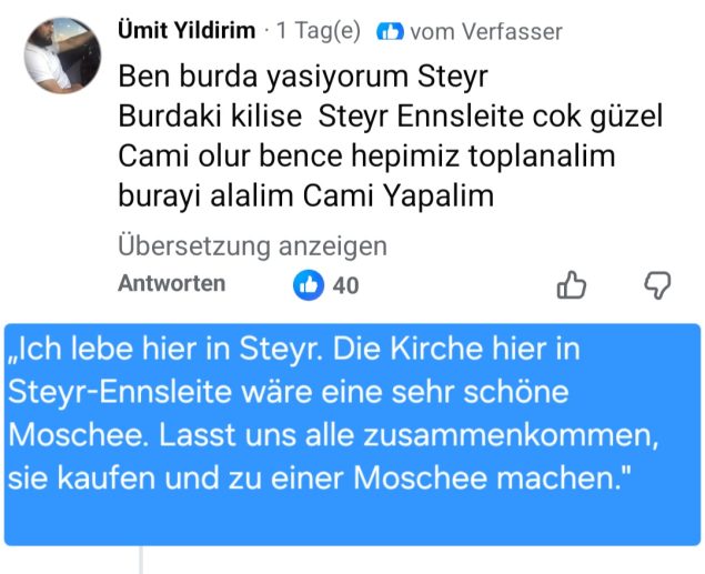 Satış kararının “herkesin içini sızlattığını” bölge papazı gerçekten ifade etti. Ancak bunun herkes için geçerli olmadığı da görülüyor denilen haberde, Steyr’de yaşayan Türk kökenli Ümit Y., şu ifadeyi kullanıyor: “Steyr-Ennsleite’deki bu kilise çok güzel bir cami olabilir. Gelin hep birlikte toplanalım, satın alalım ve camiye dönüştürelim” ifadesine yer veriliyor.