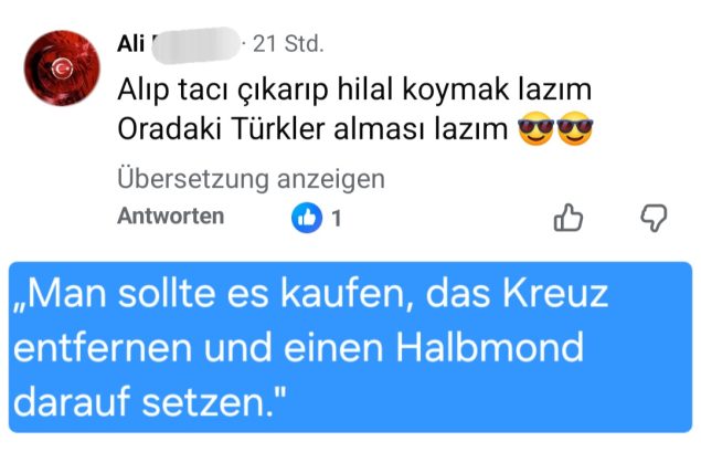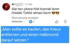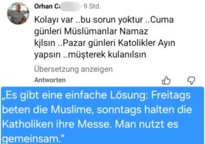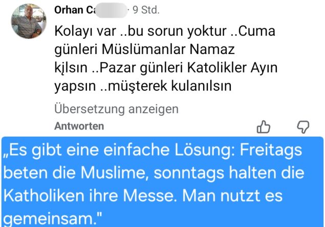 Haberin devamı şöyle: Almanya’nın Helmstedt kentinde yaşayan Erdal I. ise tartışmaya şu sözlerle katılıyor: “Yaşadığım şehirde eskiden kilise olan bir bina camiye dönüştürüldü.” Nitekim Aşağı Saksonya’daki bu şehirde, Türkiye Diyanet İşleri Başkanlığı’nın Almanya’daki uzantısı olan DITIB, yaklaşık 12 yıl önce Yeni Apostolik Kilisesi’ne ait binayı satın alarak Fatih Camii’ne dönüştürmüştü. “Fatih” ismi, 1453 yılında Bizans’ın başkenti Konstantinopolis’i fetheden Sultan II. Mehmed’e atıfta bulunuyor. Bu isimde camiler sadece Almanya’da değil, Avusturya’da da (örneğin Viyana, Wiener Neustadt, Braunau, Feldkirch ve Wörgl’de) bulunmaktadır.