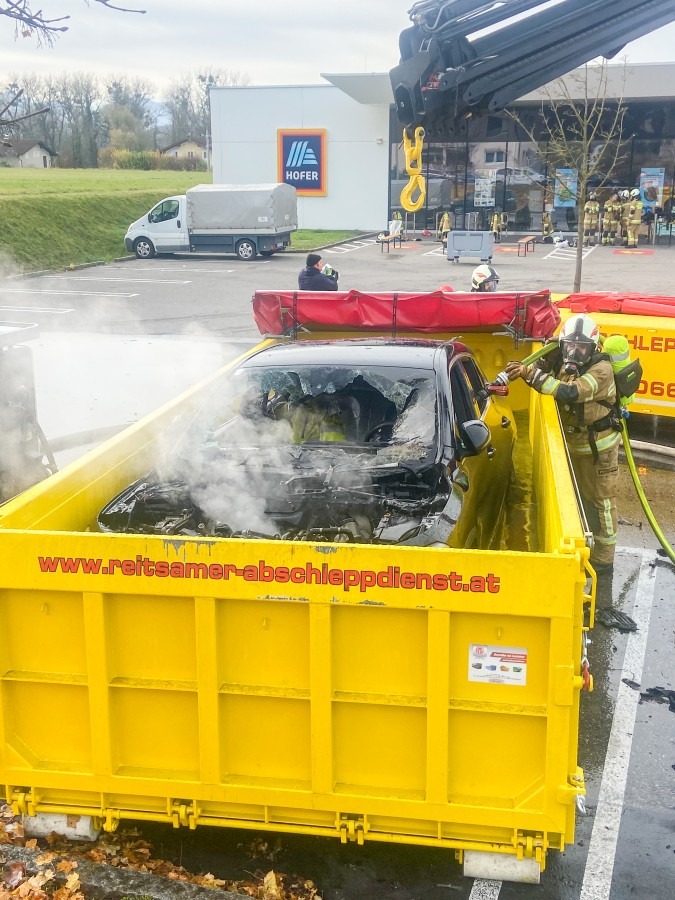 Oberndorf bei Salzburg, St. Georgen kasabasında Pazar sabahı “Hofer” otoparkında üç yıllık bir elektrikli otomobilin aküleri yanmaya başladıktan sonra, araç ertesi gün de yangın riski taşımaya devam etti.