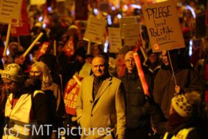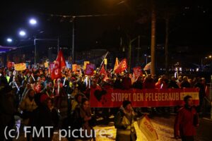 Salzburg kentinde dün akşam, şehrin bugüne kadarki en büyük protestolarından biri gerçekleşti. Binlerce kişi – aralarında Salzburg Eyalet Hastaneleri çalışanları ve ÖGB [Avusturya Sendikalar Birliği] üyelerinin de bulunduğu grup – “bakım gasbını durdurmak” sloganıyla sokağa çıktı. Protestonun hedefinde, sağ–aşırı sağ eyalet hükümetinin bakım bonusunu kaldırma planı vardı.