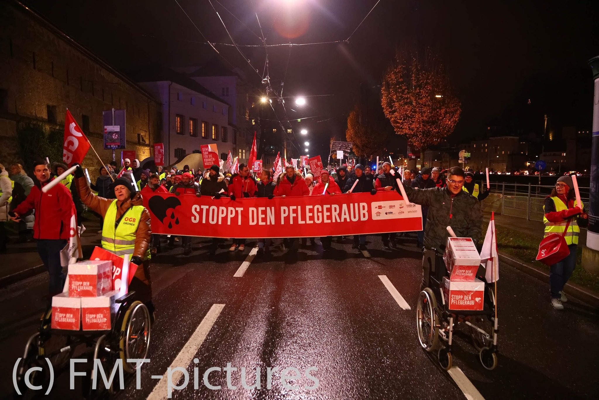 Bakım bonusuna yönelik kesinti girişimine karşı düzenlenen ikinci büyük eylem; hemşireleri, sosyal hizmet uzmanlarını ve destekçilerini tüm eyalet genelinden bir araya getirdi. İki yürüyüş kolu saat 16.00’da eş zamanlı olarak hareket etti: Biri Andräviertel’deki İşçi Odası’ndan, diğeri Eyalet Hastaneleri’nden. Kollar Staatsbrücke üzerinde birleşerek halkın yoğun desteği eşliğinde Unipark Nonntal’a yürüdü. Kapanış mitingi burada gerçekleşti.