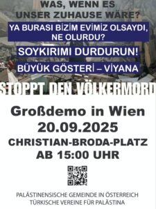 Avusturya Filistin Topluluğu, 20 Eylül Cumartesi günü Viyana’da Filistin için büyük bir gösteri düzenliyor. Gösterinin merkezinde, Avusturya’nın Ortadoğu politikasında derhal değişiklik yapılması talebi yer alıyor. Organizatörler özellikle askeri işbirliğinin sonlandırılmasını ve İsrail’e yaptırım uygulanmasını istiyor.