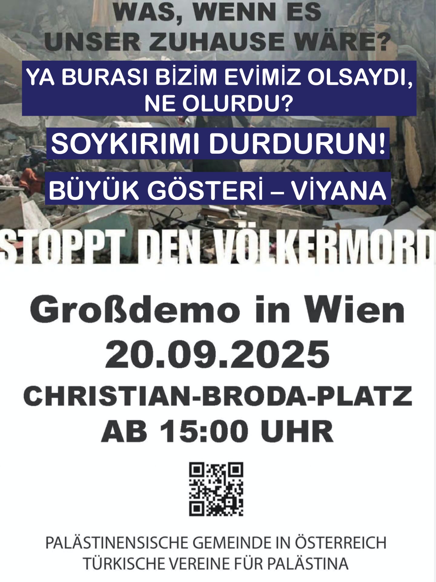 Avusturya Filistin Topluluğu, 20 Eylül Cumartesi günü Viyana’da Filistin için büyük bir gösteri düzenliyor. Gösterinin merkezinde, Avusturya’nın Ortadoğu politikasında derhal değişiklik yapılması talebi yer alıyor. Organizatörler özellikle askeri işbirliğinin sonlandırılmasını ve İsrail’e yaptırım uygulanmasını istiyor.