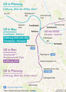 U5 hattı Karlsplatz ile Frankhplatz arasında hizmet verecek. İnşaatın 2026’da tamamlanması planlanıyordu, ancak Frankhplatz istasyonu dört yıl boyunca kullanılmayacak bir “hayalet istasyon” olarak kalacak. Wiener Linien Genel Müdürü Alexandra Reinagl, bu ertelemenin dört yıl boyunca 18–20 milyon Euro işletme gideri tasarrufu sağlayacağını belirtiyor.
