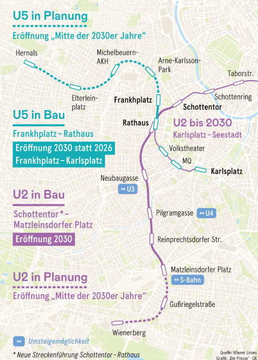 Viyana’nın metro projelerinde tasarruf baskısı, planlanan genişleme programını ciddi şekilde aksatıyor. Başlangıçta 2026’da hizmete girmesi planlanan U5 hattı, artık dört yıl gecikmeyle 2030’da açılacak. Bu gecikme, sadece U5’i değil, U2 hattının Wienerberg’e uzatılması ve U5’in Hernals’a uzatma planlarını da etkiliyor.