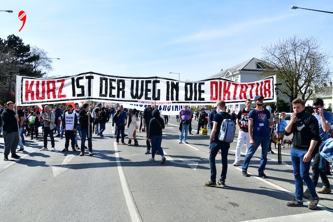 Yaklaşık beş saat, belirli aralıklarla polis karşı karşıya gelen göstericiler, Başbakan Sebastian Kurz aleyhte sloganlar attı.