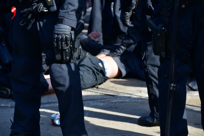 Öte yandan, bir gözaltında kelepçe kullanıldığı görüldü. Normal şartlarda gösterilerde polis kelepçe kullanma geleneği olmadığından, kelepçe ile gözaltına alınan göstericinin aranan aşırı sağ Kimlik Hareketi mensubu olduğu bilgisine ulaştık.