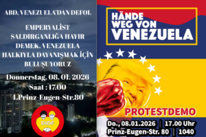 ABD’nin Venezuela’ya yönelik askeri müdahale politikalarına karşı Viyana’da protesto gösterisi düzenlenecek. “ABD, Venezuela’dan defol – saldırganlığa hayır, Venezuela halkıyla dayanışma” sloganıyla yapılacak buluşma 8 Ocak 2026 Perşembe günü saat 17.00’de, 4. Prinz‑Eugen‑Straße 80 adresi önünde gerçekleştirilecek.