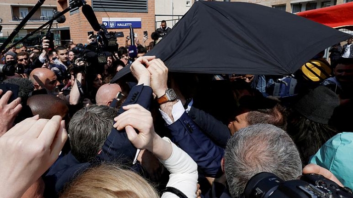 Fransa’da üç gün önce yeniden Cumhurbaşkanı seçilen Emmanuel Macron’a, başkent Paris’e 30 km mesafede bulunan Cergy kentindeki Saint-Christophe pazarını ziyareti sırasında domates fırlatıldı.