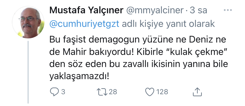 Bu sözlerin üzerine Denizlerin arkadaşı ve 68 kuşağı devrimcilerinden Mustafa Yalçıner, “Bu faşist demagogun yüzüne ne Deniz ne de Mahir bakıyordu! Kibirle “kulak çekme”den söz eden bu zavallı ikisinin yanına bile yaklaşamazdı!” İfadeleriyle yanıt verdi. | virgül