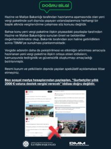 Türkiye Dezenformasyonla Mücadele Merkezi tarafından yapılan bir açıklamada, bazı sosyal medya hesaplarından paylaşılan, “Gurbetçiler yıllık 2000 Euro vatana destek vergisi verecek” iddiası doğru olmadığı belirtildi.