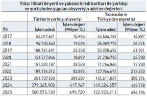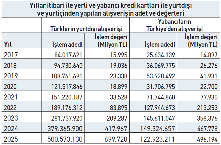Daha çarpıcı tablo işlem sayılarında ortaya çıktı. Yabancıların Türkiye’de yaptığı alışveriş işlem adedi 149,3 milyondan 122,9 milyona gerilerken, Türklerin yurt dışı alışveriş işlem sayısı 379,4 milyondan 500,6 milyona yükseldi. Bu durum, yabancıların Türkiye’de daha az sayıda ve daha pahalı ürün satın aldığını, Türk tüketicinin ise yurt dışında daha sık ve yaygın alışveriş yaptığını gösterdi.