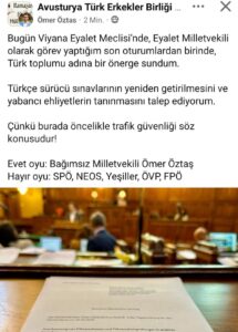 Bağımsız Viyana Eyalet Milletvekili Ömer Öztaş, Viyana Eyalet Parlamentosu’na Türkçe ehliyet sınavının yeniden uygulanması için bir önerge sunduğunu açıkladı.